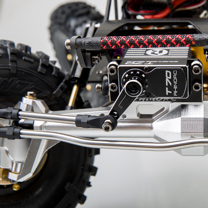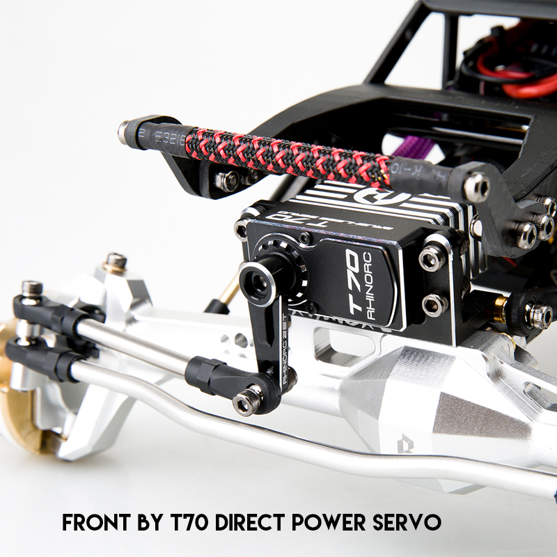 For Servo, we used RhinoRC T70(70KG) driect power servo (support 7-17V input) on Front Axles, RhinoRC T60LP70(60KG) driect power servo (support 7-17V input) on Rear Axles, high performance digital servo, Extra strong patent steel gears.